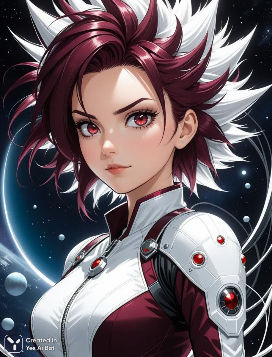 An analytical mind, a progressive environment, and the growth and progress of a girl with spiky hair are visible. A smart, stern gaze, a foamy environment with wires, bright white light and dark burgundy light, showing two polar worlds, a progressive suit made of white alloy. Super-detailed rendering, where every tiny detail and hair is visible.