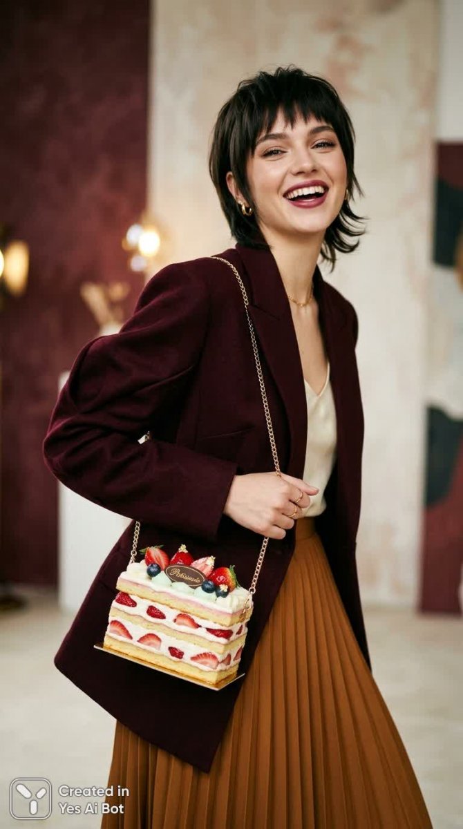 Завораживающий портрет юной модели в авангардном стиле, воплощающий смелый дух высокой моды и игривое настроение. Короткая элегантная стрижка подчеркивает изысканность образа, а дизайнерский наряд демонстрирует новаторство и креативность. Выразительное лицо с уверенной ухмылкой излучает харизму и беззаботность. В руках модель держит необычную сумку в форме реалистичного кулинарного шедевра – изысканного десерта, создающего неожиданный контраст между высокой модой и повседневными радостями жизни. Студийное освещение с мягким направленным ключевым светом и тонкой контровой подсветкой скульптурно выделяет черты лица модели, добавляя портрету глубины и объема. Глянцевые текстуры сумки эффектно контрастируют с матовыми тканями одежды, создавая визуальный интерес и подчеркивая роскошь материалов. Теплая цветовая палитра в оттенках бордового, карамельного и кремового, дополненная акцентами нежного мятного цвета, создает атмосферу уюта и элегантности. Кинематографическая малая глубина резкости фокусирует внимание на модели и ее аксессуарах, создавая ощущение присутствия и вовлеченности. Четкая детализация кожи придает портрету реалистичности и живости. Динамичная поза в три четверти демонстрирует уверенность и грацию модели. Элегантный стиль с минималистичными украшениями и безупречным макияжем завершает образ, подчеркивая изысканность и утонченность. Портрет пронизан духом модной реальности, излучает стиль и игривость, создавая при этом атмосферу изысканной утонченности и неповторимого шарма