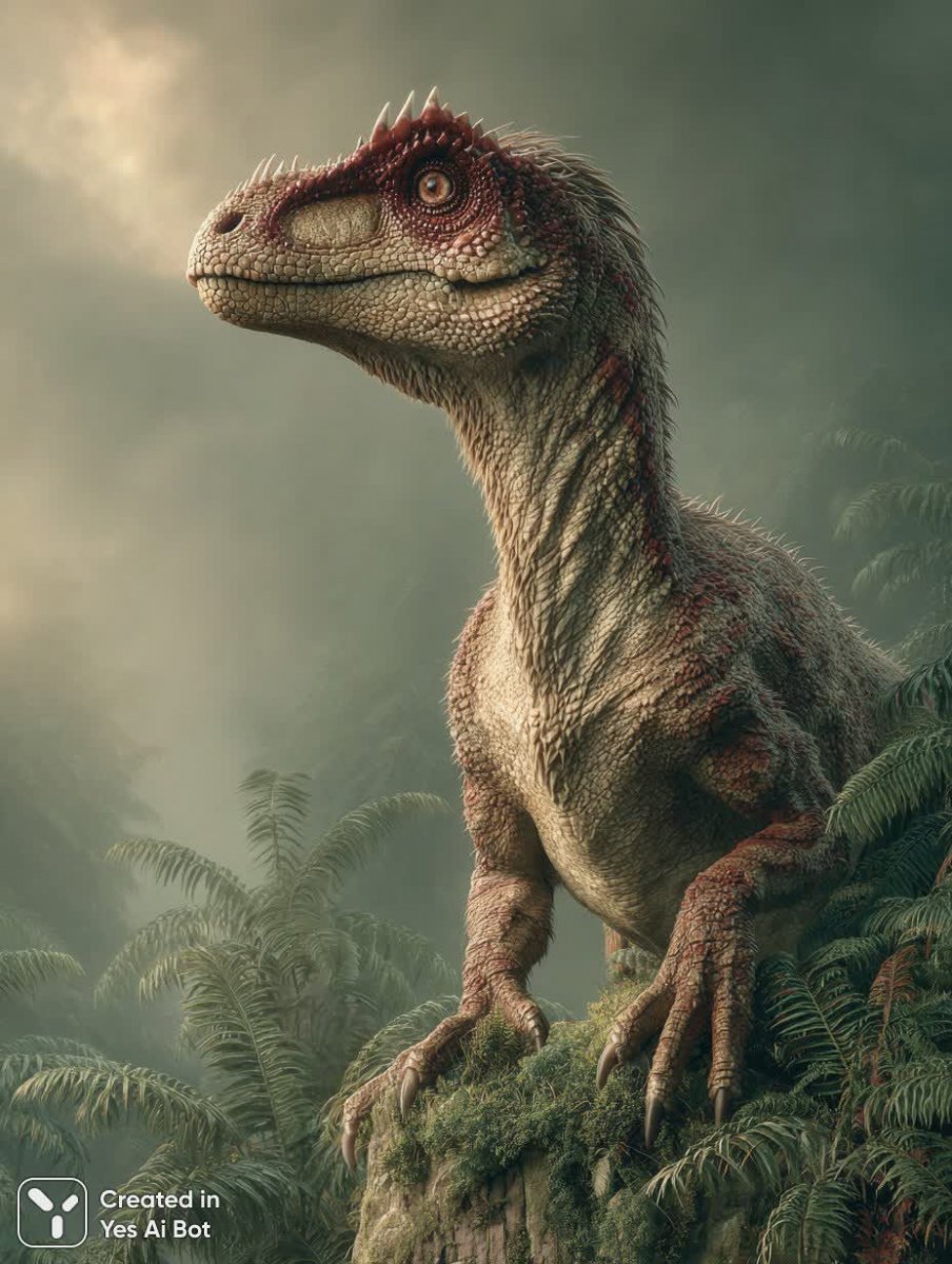 Встречайте дилофозавра в его естественной среде обитания – на краю скалистого берега древней реки, утопающей в густых влажных зарослях доисторического леса. Этот невероятно реалистичный образ переносит нас на миллион лет назад, во времена, когда Земля была совершенно иной. Огромный динозавр возвышается над пейзажем, демонстрируя свой внушительный размер и мощь. Характерные гребни на голове ярко выделяются благодаря поразительному сочетанию красного и черного цветов. Широко открытый рот обнажает ряды острых как кинжалы зубов и влажную внутреннюю ткань, а грозный рев сотрясает воздух. Кожа динозавра проработана до мельчайших деталей – грубые чешуйки, морщины и четкое выделение мышц окрашены в землисто-коричневые и желто-зеленые тона, с более светлыми желтыми чешуйками на животе и морде. Динамичная поза подчеркивает его доминирование: мощные ноги крепко держат природный камень, а когтистые руки слегка выдвинуты вперед. Внизу обрыва простирается обширный первобытный ландшафт, густо усеянный гигантскими папоротниками, древовидными мхами, цикадами и древней растительностью, частично скрытой легкой вулканической дымкой. Мягкое теплое освещение восходящего солнца пробивается сквозь плотные облака, создавая драматические тени и подчеркивая текстуру всего вокруг. Снято широкоугольным объективом с низкой точки, в документальном стиле, что делает динозавра поистине огромным и устрашающим на фоне древнего мира. Изображение выполнено в разрешении 8k с эстетикой National Geographic – это захватывающий дух взгляд на доисторическую эпоху и одного из самых известных хищников прошлого