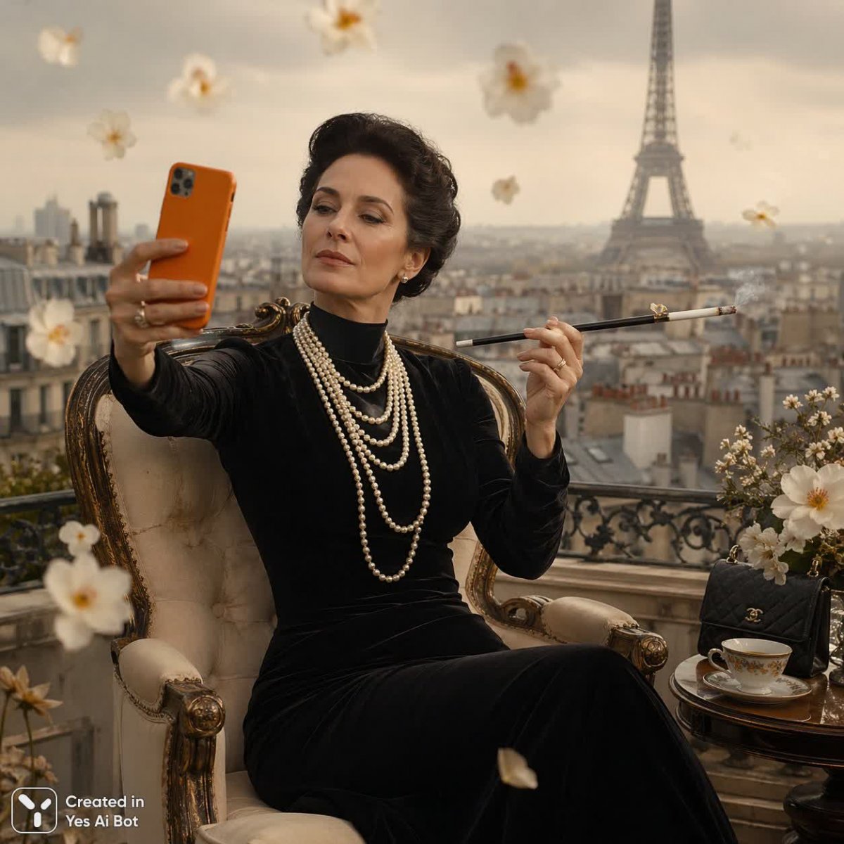 Изысканная европейка в возрасте от 50 до 55 лет с тёмными, элегантно уложенными волосами величественно сидит в богато украшенном роскошном кресле кремового цвета. На ней классическое чёрное платье в пол с высоким вырезом и длинными рукавами, украшенное несколькими нитями сверкающих жемчужин. В левой руке она держит длинный, элегантный мундштук с зажженной сигарой, а правой рукой обнимает оранжевый смартфон, направляя его на себя для селфи. Ее выражение лица передает уверенное созерцание, а взгляд устремлен на телефон. Место действия — терраса на крыше с видом на парижский городской пейзаж, на фоне которого видна знаменитая Эйфелева башня. Тон...
