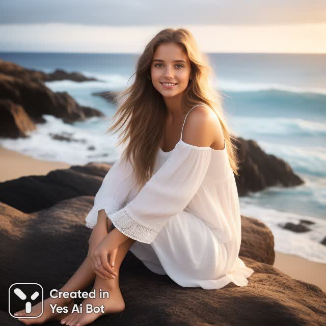 Завораживающий портрет молодой женщины, запечатленный в моменте спокойной задумчивости на фоне бескрайнего океана. Фотореалистичное изображение передает мельчайшие детали – от текстуры кожи и оттенка волос до легкой улыбки и нежного прикосновения руки к щеке. Девушка, одетая в воздушную белую блузу и голубые джинсы, сидит на темных прибрежных камнях, ее фигура слегка развернута к камере, создавая ощущение интимности и близости. Морской бриз играет с распущенными волосами, добавляя образу естественности и легкости. Драматичное небо с крупными облаками и бушующий океан служат впечатляющим фоном для этой сцены, а теплый свет golden hour придает изображению особую атмосферу умиротворения и романтики. Мягкая пленочная зернистость и приглушенная палитра цветов создают ощущение ностальгии и безмятежности, перенося зрителя на каникулы, наполненные солнцем и свободой. Образ девушки излучает спокойствие и уверенность в себе, а ее взгляд, направленный прямо в камеру, устанавливает непосредственный контакт со зрителем. Это портрет, пронизанный искренностью и красотой момента