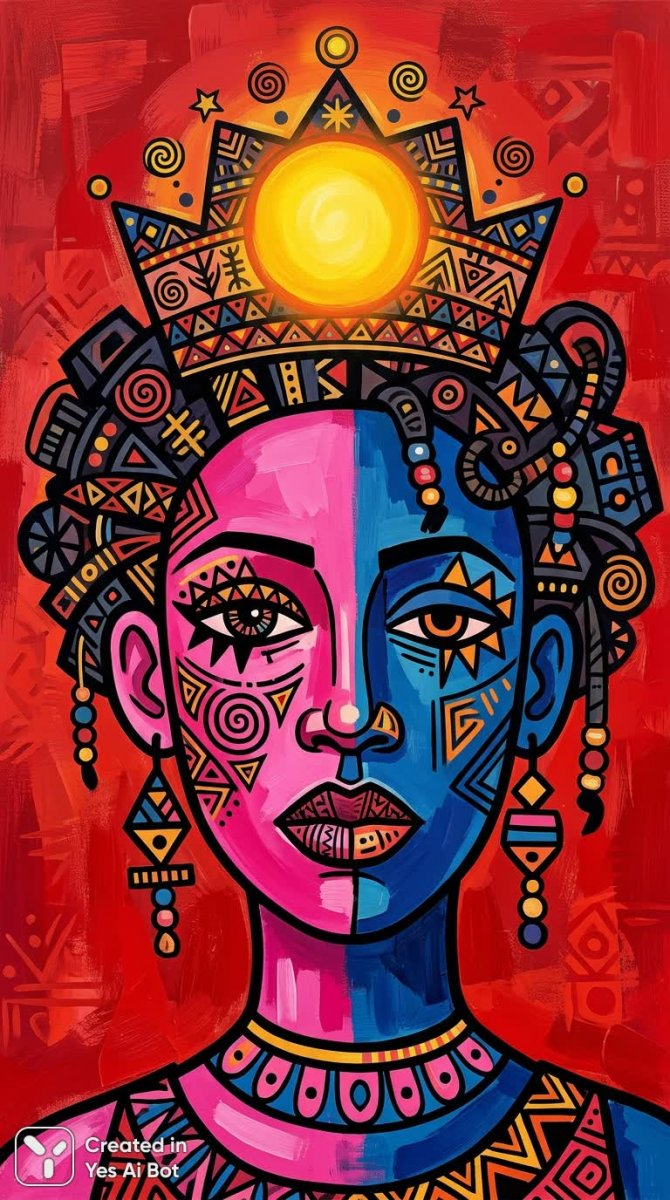 Завораживающий абстрактный портрет, где реальность переплетается с фантазией. Лицо разделено на две контрастные половины: нежная розовая палитра и насыщенный синий оттенок создают визуальный диссонанс, подчеркивая уникальность и многогранность личности. Асимметричные черты лица очерчены густыми черными линиями, добавляя графичности и выразительности изображению. Яркие, сочные цвета словно пульсируют энергией, притягивая взгляд и создавая ощущение динамизма. Изображение украшено замысловатыми африканскими узорами, которые вплетаются в структуру лица, символизируя связь с культурой и традициями. На голове модели – изящная корона, украшенная непонятными символами и стилизованным солнцем, что указывает на власть, мудрость и духовность. Яркий желтый круг, изображающий солнце, расположенный на алом фоне, добавляет композиции драматизма и подчеркивает важность небесного светила как источника жизни и вдохновения. Техника исполнения – акриловые мазки, имитирующие живописные штрихи, придают портрету текстурность и объем. Стиль иллюстрации – плоский, что упрощает композицию и делает ее более лаконичной и запоминающейся. Это не просто изображение лица, а глубокое философское высказывание о красоте, идентичности и связи человека с окружающим миром. Портрет излучает силу, уверенность и неповторимость, приглашая зрителя к размышлению о сущности человеческой природы и ее месте во Вселенной. Сочетание ярких цветов, графичных линий и этнических мотивов создает уникальную визуальную историю, полную загадок и символов