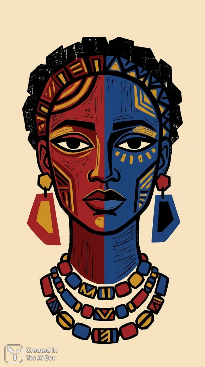Яркий этнический портрет завораживает своей необычностью и смелостью художественного решения. Лицо разделено на две контрастные половины, каждая из которых выполнена в своей цветовой палитре: одна – страстного красного, другая – глубокого синего. Акценты желтого и черного добавляют динамизма и усиливают визуальное воздействие. Монументальные геометрические серьги привлекают внимание к деталям, а декоративные украшения на шее подчеркивают культурную принадлежность изображенного человека. Работа выполнена в технике линогравюры, что проявляется в смелых графических текстурах и плотных линиях. Фон – однотонный и нейтральный, позволяющий полностью сосредоточиться на выразительном лице. Стилизованные глаза придают портрету загадочности и глубины. Композиция отличается лаконичностью и четкостью форм, создавая ощущение монументальности и силы. Это не просто изображение, а визуальная поэзия, сочетающая в себе этнические мотивы и современное графическое искусство. Портрет словно оживает, передавая внутреннюю энергию и характер модели. Он является ярким примером того, как можно объединить традиции и инновации для создания уникального произведения искусства. Использование ограниченной цветовой гаммы позволяет добиться максимальной выразительности и сосредоточить внимание на ключевых элементах композиции. Контраст цветов и текстур создает ощущение динамики и движения, а геометрические формы придают портрету современный вид