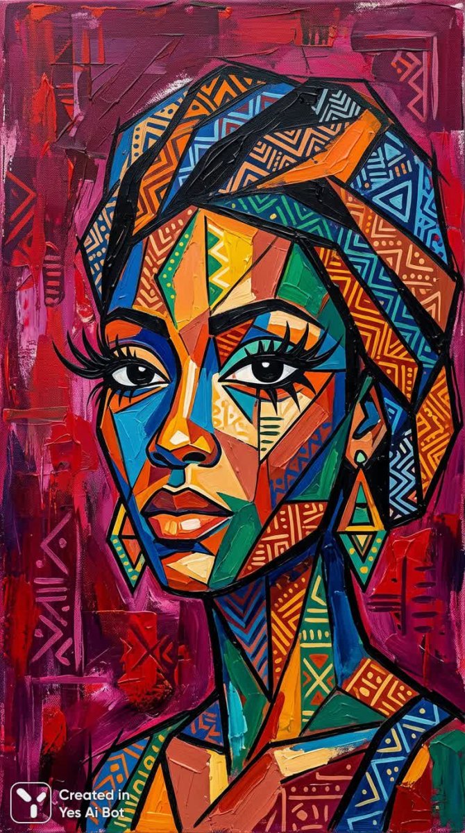 Яркий и динамичный портрет женщины в стиле кубизма завораживает своей геометрической сложностью. Лицо разделено на множество красочных фрагментов, создавая ощущение движения и многогранности личности. Крупные стилизованные глаза с длинными ресницами приковывают внимание, выражая глубину взгляда и внутреннюю силу. Четкие черные контуры подчеркивают структуру изображения, придавая ему графическую выразительность. Фон насыщенного красно-пурпурного цвета создает драматический контраст и усиливает визуальное воздействие. В композиции органично переплетаются элементы современного африканского орнамента, добавляя работе этническую самобытность и культурную глубину. Минималистичный подход к деталям позволяет сосредоточиться на основных формах и цветах, создавая ощущение лаконичности и элегантности. Текстурированные мазки кисти придают изображению объемность и тактильность, словно приглашая зрителя прикоснуться к холсту. Это произведение искусства – синтез различных стилей и техник, демонстрирующий мастерство художника в создании уникального и запоминающегося образа, сочетающего в себе силу, красоту и культурное наследие. Портрет излучает энергию и загадочность, являясь ярким примером современного кубистического искусства с африканским акцентом, выполненного с использованием выразительных цветовых решений и динамичных мазков