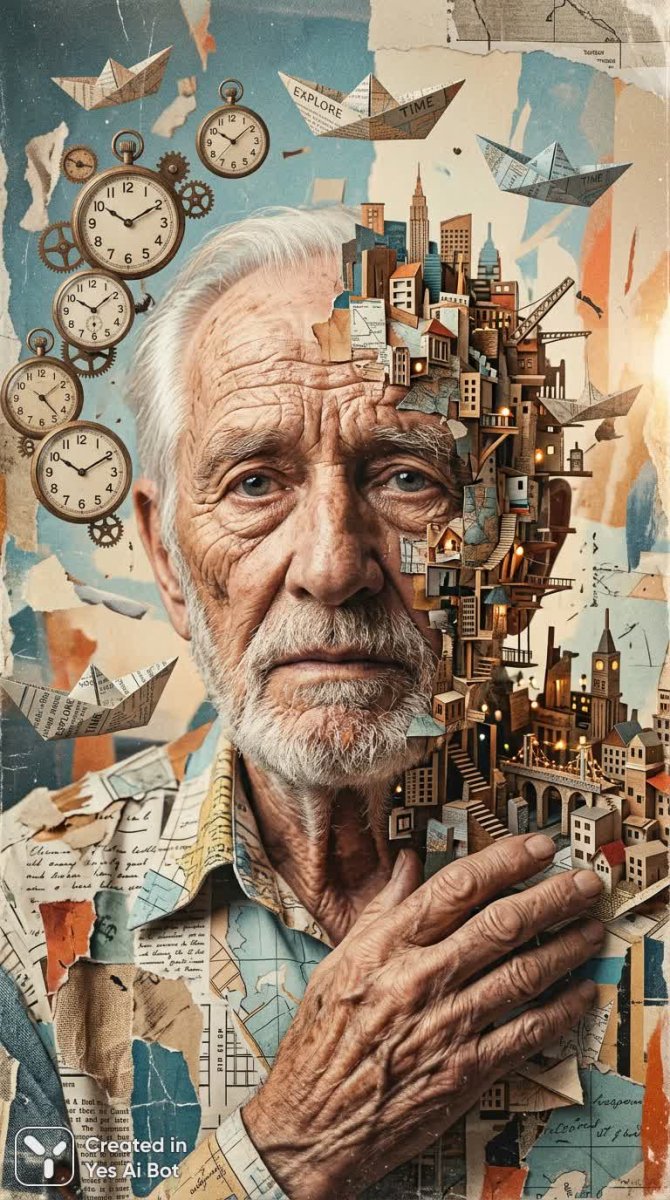 surreal collage portrait of an elderly man melting into a miniature city, avant-garde abstraction with floating clocks and paper boats, fragmented hands, melancholy and wonder, asymmetrical close-up composition, layered textures, surreal photo manipulation, soft rim lighting, cinematic grain