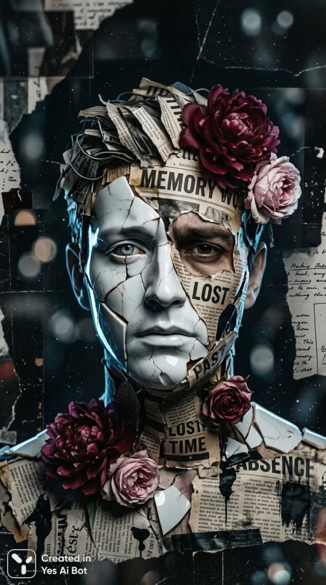 - a fragmented male bust made of porcelain and torn newspaper, surreal portrait fused with surreal collage and double exposure flowers, avant-garde psychological concept exploring memory and loss; multilayered surreal photo technique with paper tears, ink smudges and blurred film grain; asymmetrical close crop, emotive tension between calm and anguish, cinematic low key lighting, cold rim light, soft bokeh highlights and subtle dust particles.