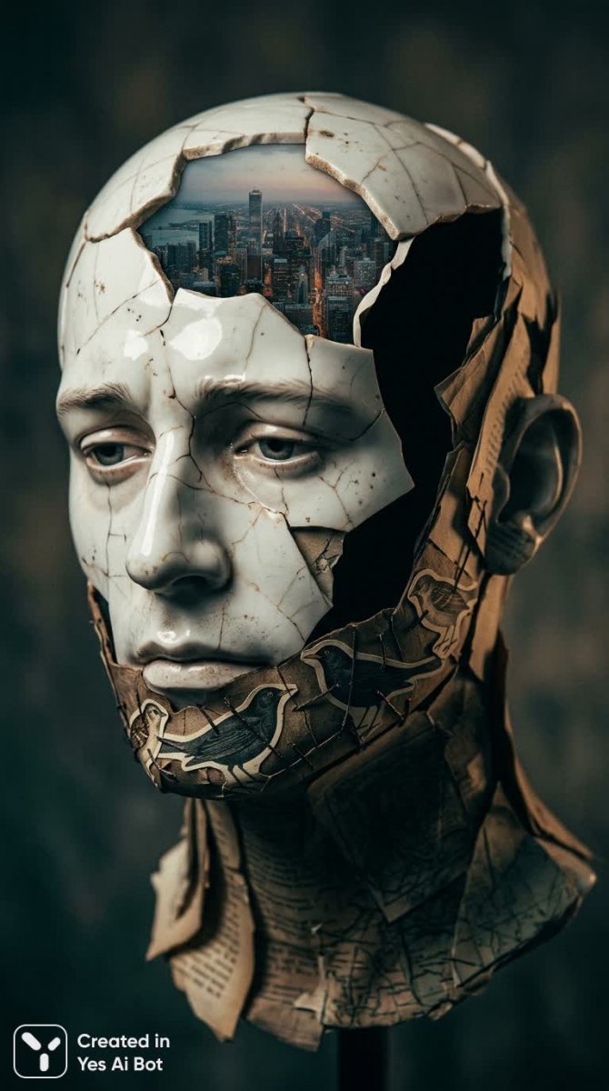 Завораживающая и тревожная композиция, представляющая собой фрагментированный бюст мужчины, выполненный из хрупкого фарфора и сложенных листов бумаги. Это сюрреалистический портрет, выходящий за рамки привычного восприятия реальности, сочетающий в себе элементы авангарда и многослойной фотографии. Техника двойной экспозиции мастерски объединяет панорамный вид городского пейзажа с внутренними пространствами черепа, создавая ощущение растворения границы между внешним миром и человеческим сознанием. Необычные коллажные вставки, такие как изображения птиц, аккуратно пришитые к линии челюсти, добавляют работе загадочности и символизма. Интимный крупный план позволяет рассмотреть мельчайшие детали текстур, подчеркивая контраст между гладкостью фарфора и шероховатостью бумаги. Атмосфера изображения пронизана меланхолией и необъяснимой тревожностью, усиливаемой асимметричной композицией и использованием негативного пространства. Кинематографическое мягкое освещение по краям создает объемный эффект, а едва заметная зернистость пленки придает изображению винтажный шарм. Тонкий цветовой сдвиг в сторону оттенков сине-зеленого (teal) и янтарно-желтого (amber) подчеркивает общую тональность задумчивости и легкой грусти, делая этот сюрреалистический портрет поистине незабываемым зрелищем, способным вызвать глубокие размышления о природе человеческого существования и хрупкости бытия. Это произведение искусства – это визуальный гимн сложности внутреннего мира человека и его взаимосвязи с окружающим пространством