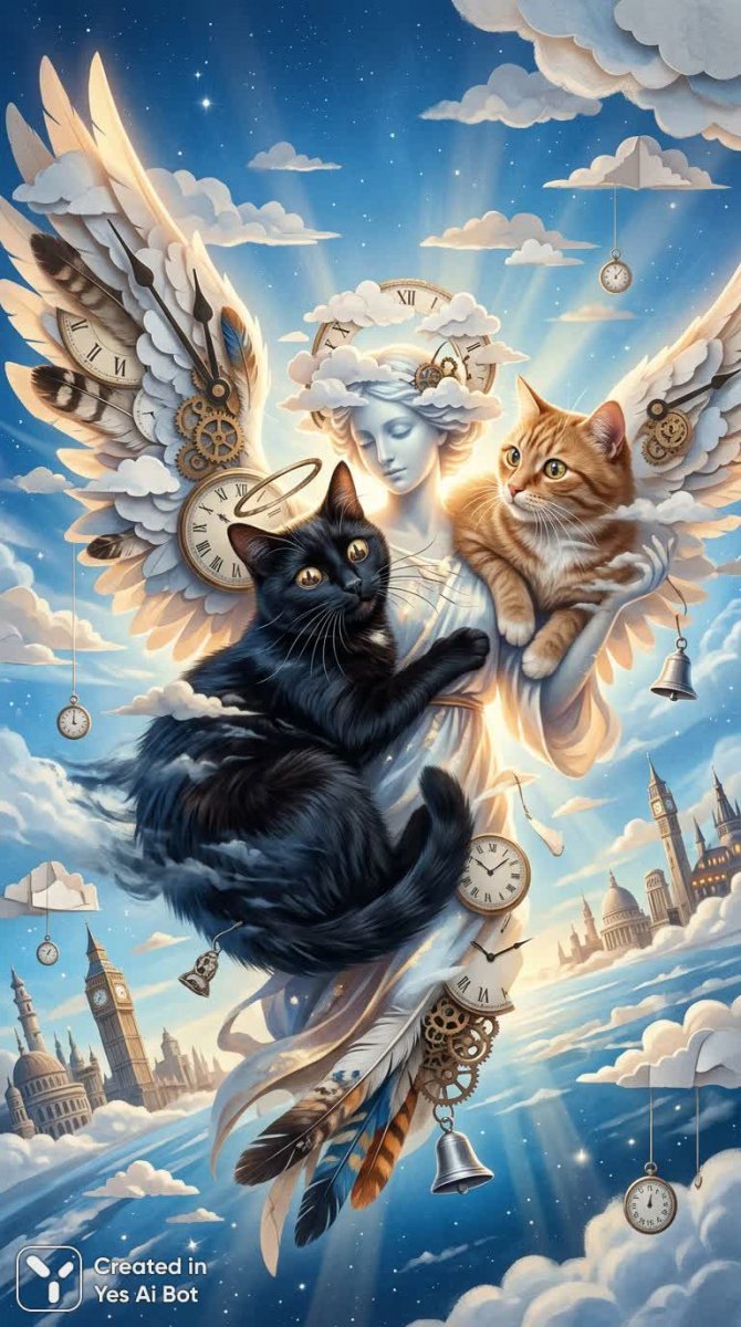 a multilayered surreal portrait of a black cat and a ginger tom woven into a floating celestial tableau under a vast blue sky scattered with slow-moving clouds, the two felines partially merged with an ethereal angel figure whose wings are made of torn paper clouds and feathered clock hands; surreal collage meets surreal photo manipulation with sections of the cats' fur dissolving into painted sky strokes and soft cumulus textures, double exposure effects reveal antique portrait silhouettes and distant cityscapes inside their pupils, avant-garde abstraction in the composition where the horizon tilts and gravity feels optional, emotional contr...