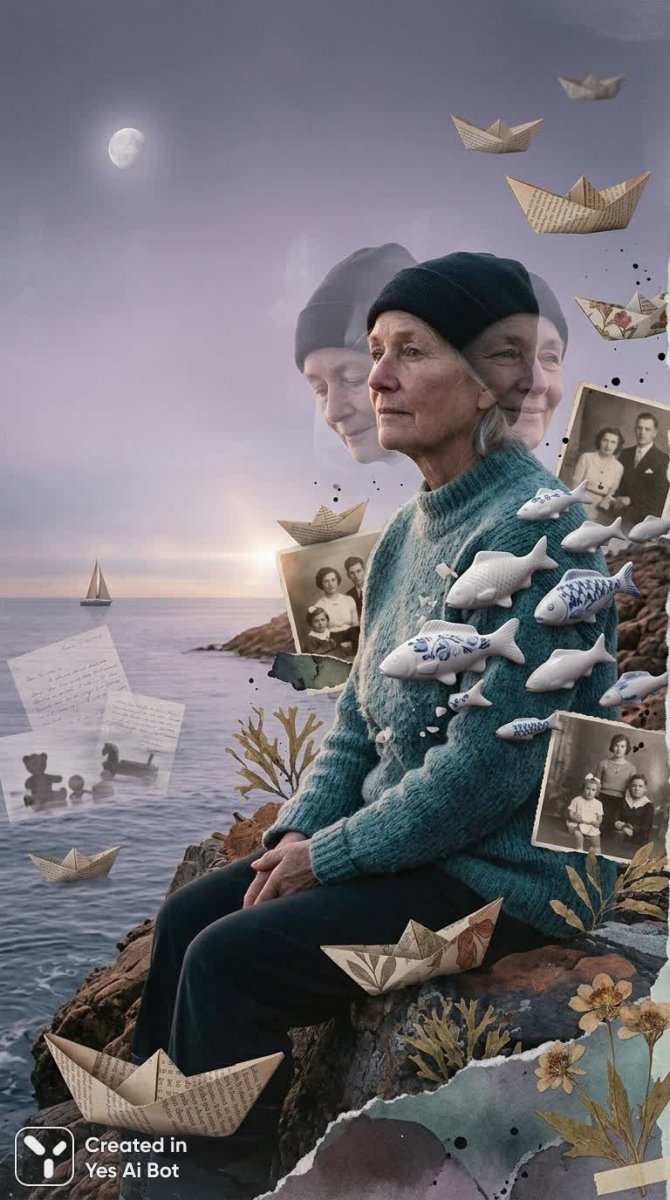 Завораживающая многослойная сюрреалистическая композиция изображает одинокую рыбачку, чье тело постепенно перетекает в косяк фарфоровых рыб. Это портрет, сотканный из полупрозрачных слоев, демонстрирующих различные выражения лица, погружающий зрителя в мир тихой меланхолии и безмятежного удивления. В центре внимания – крупная фигура, изображенная в три четверти, сидящая на пустом берегу на закате. Ее окружает сюрреалистический пейзаж: парящие острова из сложенных бумажных лодочек, выцветшие ботанические гравюры и старые семейные фотографии, будто дышащие воспоминаниями. Мастерски сочетая фотоманипуляции, коллаж и живописную технику, автор создает уникальный эффект – детализированная кожа контрастирует с матовой керамикой рыбьего тела, а нежные акварельные разводы переплетаются с зернистостью фотографии. Цветовая палитра приглушенных оттенков: лазурно-зеленый, медно-охристый и лавандовый туман – усиливает эмоциональную атмосферу тоски по прошлому и легкого зловещего любопытства. Тщательно выверенная асимметрия с использованием негативного пространства слева позволяет фотонадпечаткам плавно перемещаться, а вдалеке мерцает маленький парус света. Мягкое кинематографичное освещение от низко висящей луны подчеркивает серебристые блики на фарфоровых чешуйках и влажных глазах. Эффекты двойной экспозиции создают ощущение волн, содержащих едва различимые силуэты детских игрушек. Текстура холста проглядывает сквозь полупрозрачные слои, а нарочито выставленные швы от чернил и коллажа подчеркивают многослойную природу графического произведения. Это произведение искусства исследует темы идентичности и утраты через символические объекты, сочетая фотографический реализм с мечтательной абстракцией и завораживающим спокойствием