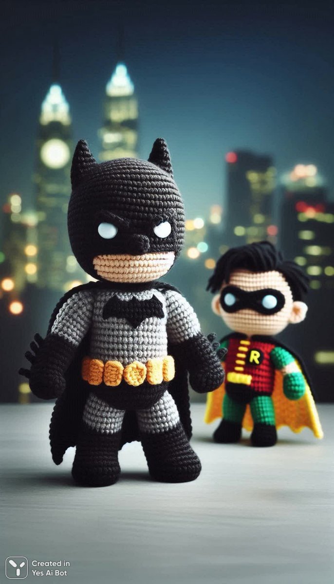 Амигуруми: Бэтмен и Робин из крошечного Готэма в стиле вязаных игрушек - Результат работы нейросети Dalle 3