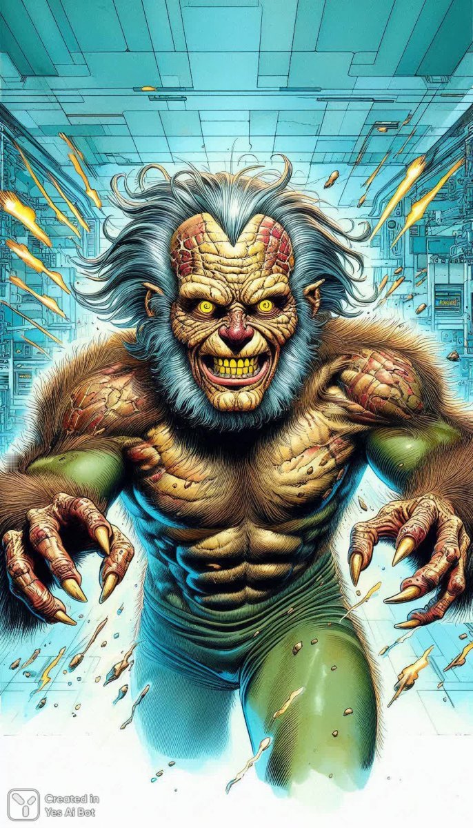 Comic Book style. An old human face with a feral grin, lots of dyed fur and eyes with a yellow glint, four arms, flying splinters, a dynamic defensive pose, and a technologically advanced background, predominantly silver-blue. Super-detailed rendering, where every tiny detail and hair is visible. Comic Book style 1970, watercolor technique with ink and alcohol ink outline.