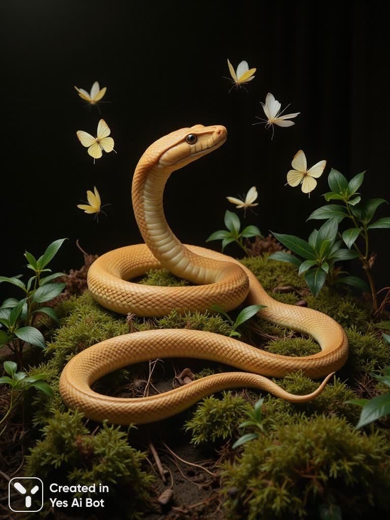 Завораживающая сцена природы, где изящный золотисто-коричневый змей, гордо подняв голову и слегка приоткрыв пасть, крадется по мшистой земле, усыпанной сочной зеленью листьев. Нежная пастельная гамма – бледно-желтые и белоснежные бабочки беспокойно порхают в воздухе, создавая ощущение хрупкости и легкости. Драматическое освещение, игра света и тени в стиле кьяроскуро, подчеркивает напряженность момента, а темный фон усиливает эффект глубины и концентрации на центральном объекте. Картина выполнена в духе голландского Золотого века, с вниманием к деталям и реалистичной передачей текстур. Расположение камеры на уровне глаз позволяет зрителю ощутить непосредственность происходящего, словно он сам является свидетелем этой динамичной сцены, где сталкиваются силы хищника и беззащитность нежных насекомых. Вся композиция пронизана ощущением скрытой опасности и невероятной красоты дикой природы, заставляя задуматься о тонком балансе между жизнью и смертью в окружающем мире. Это произведение искусства захватывает внимание своей реалистичностью и мастерством исполнения, передавая зрителю неповторимую атмосферу таинственности и драматизма. Картина демонстрирует глубокое понимание природы и умелое владение техниками живописи, создавая незабываемое визуальное впечатление