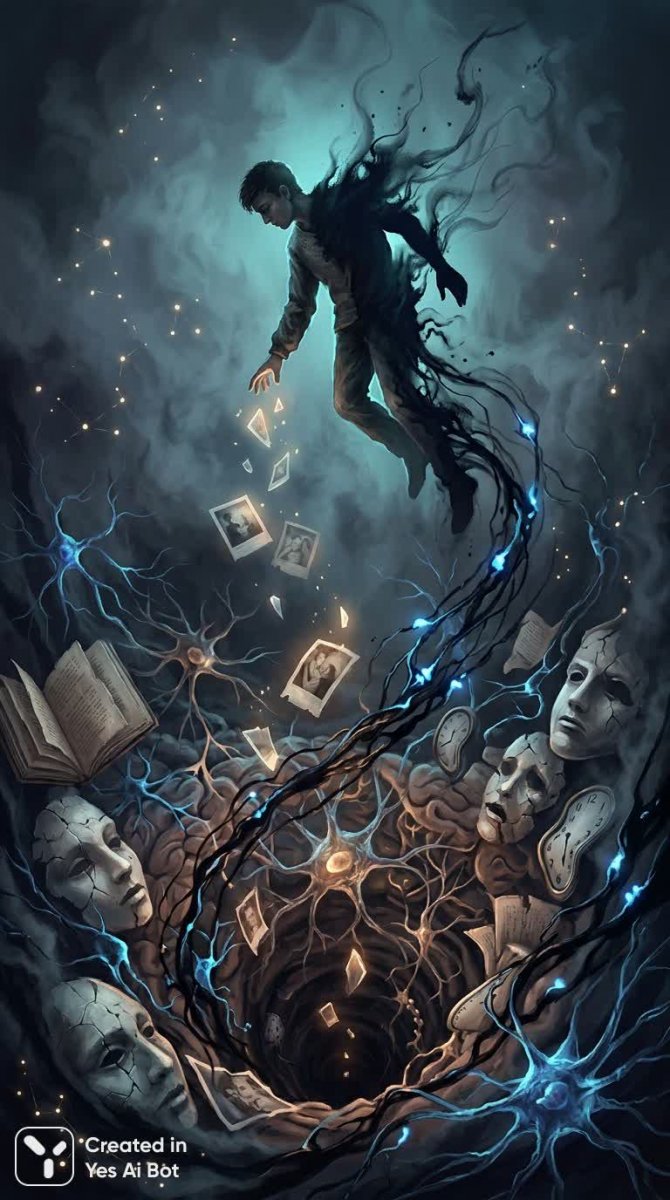 A surreal, conceptual depiction titled "Abyss of the Mind", a lone figure suspended above a yawning void composed of interwoven neurons, torn pages, fragmented faces and melting clocks, the figure half-human half-silhouette reaching toward drifting memory fragments, tendrils of ink and electric blue synapses spiraling downward into immeasurable depth, atmospheric fog and scattered constellations of thought particles, dramatic chiaroscuro lighting with a cold teal rim and warm amber glows emanating from memory shards, deep indigo and charcoal blacks dominate the palette accented by electric blue and burnt sienna, composition centered on the ve...