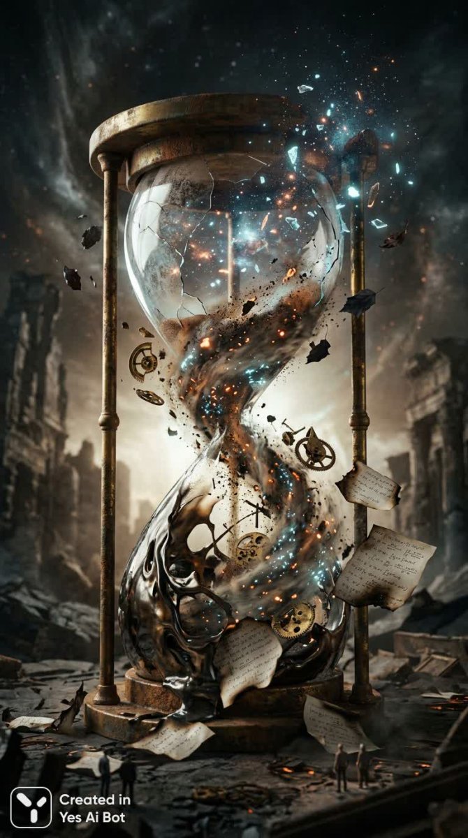 Завораживающее видение энтропии – монументальный песочные часы, медленно рассыпающиеся на части, превращаясь в бурный вихрь из пепла и ржавчины. Искрящиеся частицы света, обломки шестеренок, разорванные страницы с формулами, увядшие листья, закрученные в восходящие потоки – все это создает ощущение неумолимого разрушения и глубокой печали. Хрупкое стекло верхней части песочных часов трескается, рассыпаясь на далекие созвездия, словно угасающие воспоминания. Нижняя часть переполняется тягучей, плавящейся металлической массой и обгоревшими клочками бумаги, символизируя окончательное растворение в хаосе. Мягкий объемный свет, проникающий из-за объекта, создает длинные драматические тени, где тлеющие угли переплетаются с холодными синими искрами, добавляя мистической глубины происходящему. Цветовая палитра построена на приглушенных оттенках охры и умбры, глубоком черном цвете сажи и ледяных акцентах циан. Тщательно проработанные текстуры треснувшей керамики, корродированного латуни и нежного стеклянного порошка усиливают ощущение времени и упадка. Кинематографичная композиция с небольшой глубиной резкости подчеркивает атмосферу неизбежности и меланхоличного величия, погружая зрителя в мир символизма и сюрреализма, где красота переплетается с тоской по утраченному. Это завораживающее произведение искусства заставляет задуматься о бренности всего сущего и неумолимом течении времени