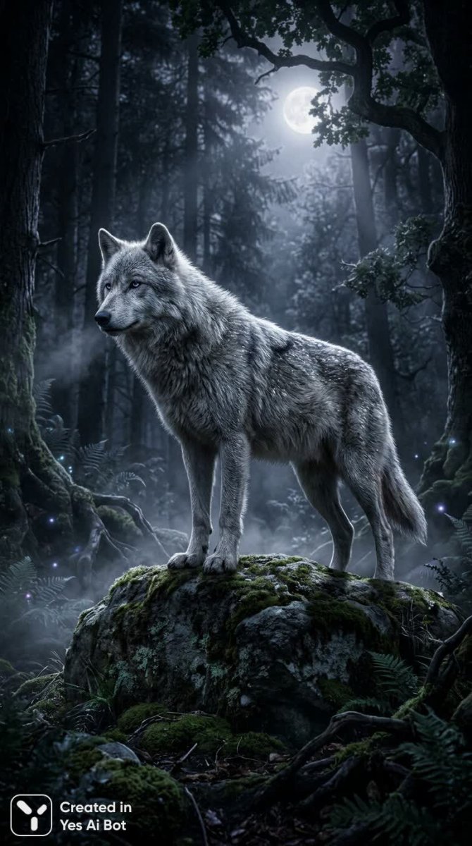 Серебряный волк в лунном свете древнего леса: воплощение силы и одиночества - Картинка, полученная с помощью нейросети Nano Banana