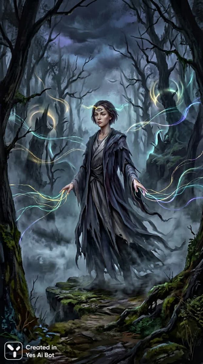 Загадочный портрет, сотканный из символов и сновидений, воплощает шестую чувственность. В центре композиции – одинокая фигура андрогинного существа, стоящая на границе таинственного леса, окутанного предвечерним туманом. Над бровью едва заметно мерцает третья глазница, источник внутреннего видения, а из кончиков пальцев вытекают переливающиеся нити восприятия, словно тончайшие волокна паутины, сплетающие реальность и иллюзию. Вокруг далеких деревьев возникают едва уловимые синестетические ореолы, будто звуки обретают видимую форму в виде полупрозрачных лент, танцующих в воздухе. Мягкий объемный свет проникает сквозь низкую пелену тумана, создавая игру теней и подчеркивая глубину пространства. Цветовая палитра выдержана в приглушенных тонах: угольно-черный и индиго доминируют, но разбавлены яркими акцентами электрического золота и бирюзового, придающими изображению мистическую энергию. Кожа персонажа отличается невероятной нежностью и реалистичностью, а струящиеся полупрозрачные одежды сливаются с туманом, стирая границы между телом и окружающей средой. На лице застыло созерцательное выражение, отражающее глубокие размышления и связь с потусторонним миром. Общая атмосфера пронизана тихой неземной красотой, а стиль живописи – это мастерски выполненный сюрреализм с высоким уровнем детализации, создающий драматичный контраст и кинематографическую композицию, полностью сосредоточенную на центральной фигуре. Картина вызывает сильные эмоции, погружая зрителя в мир тайн и загадок, пробуждая воображение и заставляя задуматься о природе восприятия