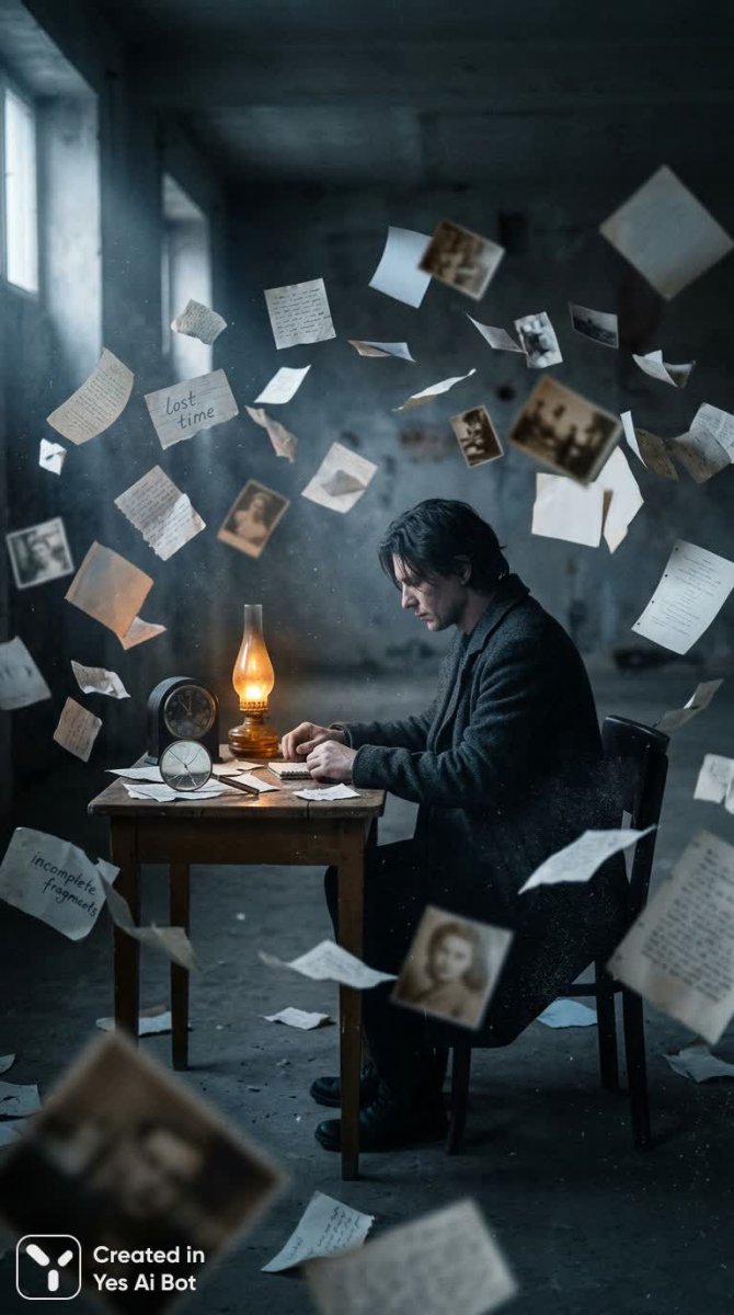 nanobanana Затерянный в тишине: фрагменты памяти и ускользающее время. Картинка из нейронной сети Nano Banana