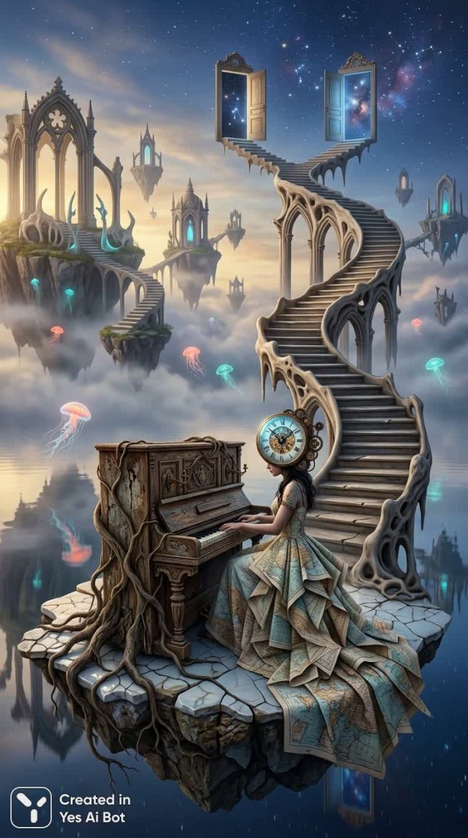 A vast surreal dreamscape where floating islands drift above a mirrored sea, on the nearest island a solitary antique piano grows tree roots into cracked porcelain, a woman with a clock for a face sits at the piano wearing a gown made of folded maps, melting staircases spiral into the sky and lead to doors that open onto constellations, impossible architecture blends classical arches with organic bone structures, soft fog rolls between islands carrying luminous jellyfish, cinematic surrealism, ethereal and uncanny mood, soft golden backlight at dusk contrasting with cool ultramarine shadows, accents of coral and teal, intricate textures of ol...