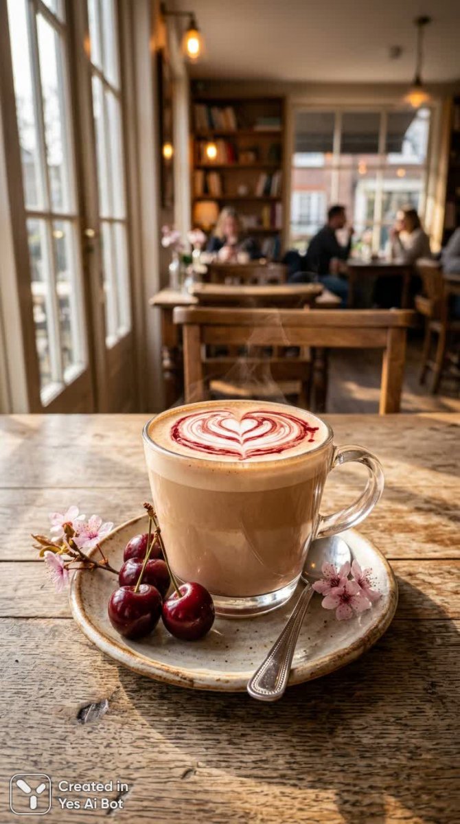 Уютное утро: кофе с вишней и нежная латте-арт в стиле кино - Картинка, созданная нейросетью Нано Банана