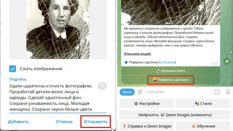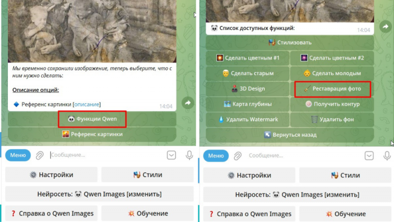 В этой статье я покажу метод, как отреставрировать фото с помощью нейросети и выполнить восстановление старых фотографий без Photoshop быстро и просто. Расскажу, как нейросеть Qwen выполняет реставрацию старых фото, улучшает цвет, убирает шумы и возвращает чёткость. А также покажу, как пользоваться нейросетями через телеграм-боты без сложных настроек, регистрации и зарубежных карт. Что такое нейросеть Qwen и почему она меняет подход к реставрации фото Qwen — еще одна продвинутая нейросеть, созданная для работы с изображениями. Она объединяет функции генерации, редактирования и восстановления фотографий, превращаясь в полноценный инструмент для реставрации фото и не только. Если в классическом Photoshop пользователю приходится вручную ретушировать каждую деталь, то Qwen анализирует снимок и выполняет сложные операции автоматически: устраняет царапины, убирает шумы, выравнивает цвет и даже раскрашивает старые черно-белые кадры. И это только малая часть ее возможностей. С помощью Qwen также можно менять отдельные детали (одежду, прическу, предметы), стилизовать изображения, удалять водяные знаки, убирать фон и много чего еще, но сегодня не об этом. Главное отличие Qwen от привычных графических редакторов — работа с текстовыми промтами. Достаточно описать, что нужно сделать («восстановить лицо», «убрать повреждения», «поднять резкость»), и нейросеть выполняет задачу без сложных настроек и слоёв. Благодаря этому Qwen становится настоящей альтернативой Photoshop: результат сопоставим по качеству, но процесс гораздо проще и быстрее. Как пользоваться нейросетью Qwen без установок и регистрации Qwen можно установить на компьютер, но для локальной версии требуются мощная видеокарта и большой объём оперативной памяти. Также у модели достаточно сложная внутренняя настройка, новичку самостоятельно разобраться будет весьма энергозатратно. Тут нам на помощь приходят онлайн-сервисы и телеграм-боты, которые интегрировали Qwen. Здесь все действия выполняются нейросетью прямо в браузере или мессенджере: не нужно скачивать программы, разбираться в драйверах и резервировать место на диске. В большинстве сервисов для реставрации фото с помощью нейросети онлайн вы просто загружаете снимок, прописываете промт и получаете результат — Qwen не исключение. Я в основном пользуюсь телеграм-ботом: интерфейс минимален, никаких лишних кнопок, а качество восстановления ничем не уступает полноценной установке. Это особенно удобно для быстрой работы с архивами или семейными альбомами, когда важна не только точность, но и скорость. Пошаговое руководство: как восстановить старые фотографии онлайн Достаточно теории, пора переходить к практике и конкретным примерам. Покажу вам пошагово как отреставрировать фото с помощью нейросети онлайн на базе телеграм-бота от YesAi. 1. Заходим в телеграм-бот. 2. Через скрепку отправляем старое фото, которое хотим восстановить. 3. Выбираем в меню Функции Qwen => Реставрация фото 4. Дожидаемся результата – обычно около 1 минуты. На выходе вы получаете обновленное изображение с улучшенной детализацией, цветами и четкостью. Никаких сложных инструментов и фильтров — всё делает нейросеть и предустановленные настройки бота. Иногда при восстановлении портретов, нейросеть ошибается и, например, добавляет возраст молодой девушке или делает изображение цве