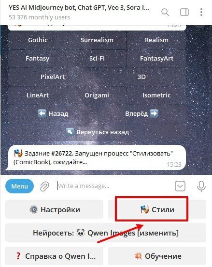 Как изменить стиль изображения или фото с помощью нейросети и фильтров — простые способы стилизации онлайн. Используйте современные нейросети для быстрого изменения стиля, наложения фильтров на фото и оформления уникальных эффектов без сложных программ. Фильтры долго оставались быстрым способом улучшить фото: удобно, просто, красиво. Один клик — и снимок уже похож на арт. Со временем такой подход перестал вдохновлять — эффект стал предсказуемым. Когда пользователи пробуют изменить стиль изображения с помощью нейросети, всё выглядит иначе. Достаточно загрузить фото и выбрать стиль, соответствующий настроению, и результат становится не улучшенной копией, а визуальным отражением эмоций. Сегодня стилизация фото онлайн через фильтры — это не про красоту, а про атмосферу. Можно выбрать любое настроение: стать героем комикса, раствориться в мягких пастельных тонах или придать фото кинематографичность. Нейросеть не исправляет кадр, а помогает передать ощущение момента, превращая визуал в язык эмоций. Стилизация фото онлайн через фильтры уже не решает задачу самовыражения Фильтры долго помогали создавать «идеальные» фото — яркие, ровные, выверенные по цвету. Но постепенно они перестали вызывать эмоции. Все стало слишком предсказуемо и однообразно. Фильтры уже не помогают выразить замысел, а лишь скрывают индивидуальность кадра. Когда пользователи пытаются наложить фильтр на фото онлайн, результат часто оказывается слишком похожим на тысячи других снимков. Лента теряет динамику, а изображения — характер. Все чаще возникает желание не просто улучшить, а передать настроение. И именно здесь нейросеть становится инструментом, который позволяет говорить визуально, не следуя шаблонам. Сегодня изменить стиль фото нейросеть может даже не опытный пользователь. Достаточно загрузить изображение, задать несколько слов и наблюдать, как искусственный интеллект переводит идею в визуальный язык. Нейросеть Qwen Images улавливает замысел — цвет, свет, атмосферу — и создает не просто обработанный снимок, а визуальное высказывание, наполненное смыслом. Процесс воспринимается как естественная игра с визуалом. Стилизация фото онлайн через фильтры работает интуитивно: выбирается стиль, нажимается кнопка — и изображение обретает собственный характер. Это уже не декоративный эффект, а новая форма визуального выражения. Нейросеть словно улавливает подтекст и превращает каждый кадр в отражение состояния — живое, лёгкое и естественное. Как изменить стиль фото через нейросеть? Процесс стилизации фото похож на игру: все происходит легко и естественно, без сложных настроек и команд. Достаточно выбрать стиль, нажать кнопку, и изображение моментально обретает настроение. Нейросеть улавливает интонацию кадра и превращает каждый стиль в отражение состояния — живое, выразительное и уникальное. Шаг 1 Откройте Yes Ai Bot. Шаг 2 Добавьте исходное изображение для обработки, без промпта. Шаг 3 Выберите пункт «Функции Qwen» в меню. Шаг 4 Нажмите кнопку «Стилизовать». Шаг 5 Укажите нужный стиль (в данном примере — космический стиль Space). Шаг 6 Дождитесь завершения генерации результата. Полученное изображение не выглядит шаблонно — нейросеть создает индивидуальное решение, передающее настроение и идею кадра. Такой подход делает взаимодействие с искусственным и