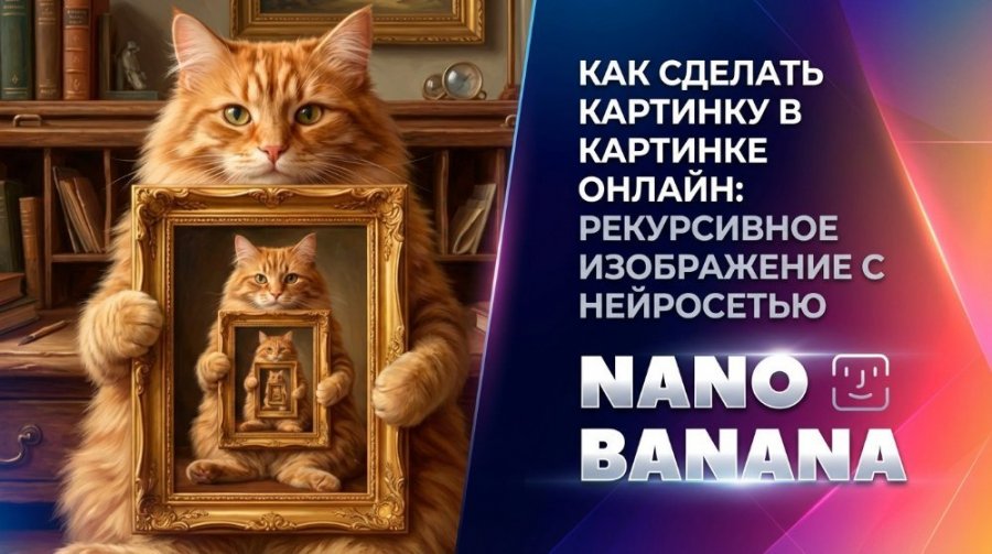 Как сделать картинку в картинке онлайн: рекурсивное изображение с нейросетью Nano Banana Pro. Узнайте, как вставить картинку в картинку с подробным пошаговым руководством. Откройте для себя методы создания уникальных визуальных эффектов с использованием современных технологий. Экспериментируйте с изображениями легко и быстро. Запрос «как сделать картинку в картинке онлайн» стабильно появляется в обсуждениях генеративной графики. Пользователей интересует не просто визуальный эффект, а контролируемое рекурсивное изображение, где объект корректно повторяется вглубь кадра без искажений и смазанного центра. Ниже представлено пошаговое руководство, позволяющее вставить картинку в картинку, с разбором типичных ошибок и рабочих формулировок. Отдельное внимание уделено тому, как нейросеть Nano Banana Pro справляется с задачей вложенной композиции и какие настройки влияют на сохранение идентичности объекта на каждом уровне рекурсии. Что такое рекурсивное изображение или «картинка в картинке» Рекурсивное изображение — это композиция, в которой объект содержит уменьшенную копию самого себя. Внутри изображения находится та же сцена, затем ещё одна — и так до визуальной бесконечности. Глаз воспринимает это как тоннель, уходящий в центр кадра. В классическом искусстве такой приём называют эффектом Дросте (Droste Effect). Это не просто декоративный трюк. Речь идёт о визуальной рекурсии — повторяющейся структуре, где каждая вложенная часть подчиняется тем же правилам композиции, что и исходная сцена. Важно отличать рекурсию от зеркального отражения. Зеркало создаёт симметрию. Рекурсивное изображение создаёт глубину. Объект не просто отражается — он повторяется в уменьшенном масштабе внутри самого себя. Почему этот эффект воспринимается как «магия»? Мозг ожидает, что изображение закончится границей рамки. Когда внутри появляется точная копия той же сцены, возникает парадокс восприятия: центр как будто не имеет предела. Возникает ощущение бесконечности, даже если уровней повторения всего 5–7. Рекурсивное изображение удерживает взгляд дольше обычной композиции, потому что мозг не находит финальной границы сцены. Этот эффект работает по трём причинам: Повторение формы — мозг быстро считывает знакомую структуру. Масштабирование — каждый следующий уровень меньше предыдущего. Перспективное сужение — взгляд естественно уходит в центр. Если хотя бы один из этих элементов нарушен, рекурсия «ломается». Почему феномен стал актуальным в эпоху генеративной графики? Раньше создание такого изображения требовало ручной работы в графическом редакторе. Сейчас достаточно понять, как сделать картинку в картинке онлайн, и задать правильную структуру запроса. Но именно здесь и проявляется сложность. Рекурсивное изображение требует от модели: Сохранить идентичность объекта на каждом уровне; Удержать пропорции; Не потерять детали в центре; Корректно уменьшать масштаб. Поэтому приём «картинка в картинке» стал своеобразным стресс-тестом генеративных систем. Если модель справляется с глубокой вложенностью без артефактов, значит она удерживает структуру сцены, а не просто стилизует поверхность. Чтобы корректно вставить картинку в картинку, нужно понять структуру: Есть главный объект; Есть рамка или граница; Внутри — та же сцена; Масштаб уменьшается 