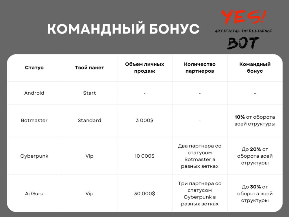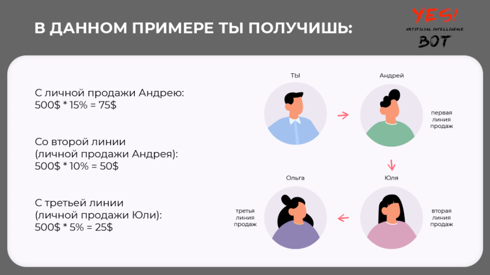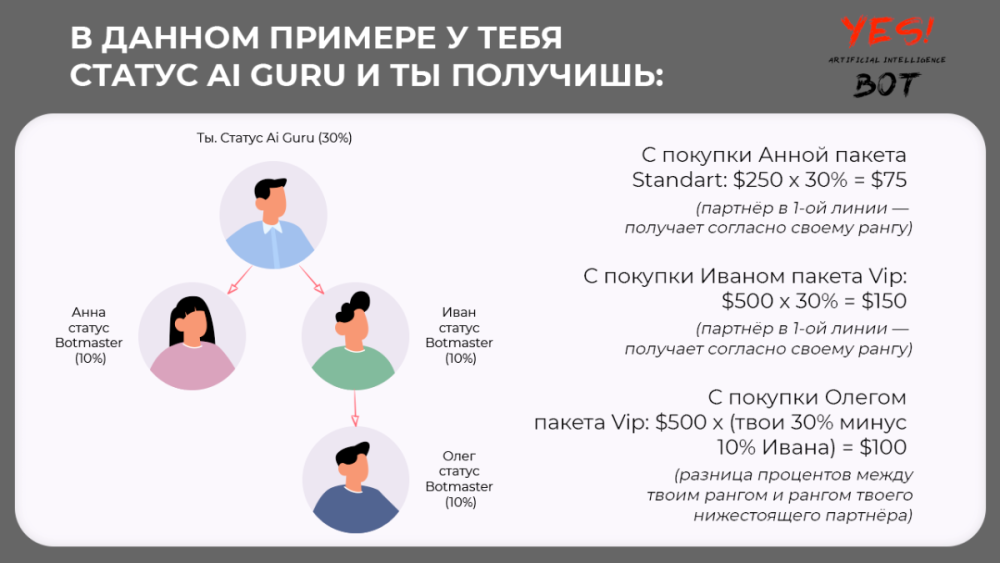Партнерские программы представляют собой отличный способ для продвижения разнообразных товаров и услуг. Чтобы удовлетворить запросы наших партнеров, предлагаем два типа вознаграждений. В этой статье приведены примеры расчета каждого из них. Стоимость пакетов: Demo - без оплаты (не включает участие в партнерской программе); Start - 30 долларов в месяц; VIP 30 - 50 долларов в месяц; Standard - 250 долларов в год; VIP - 500 долларов в год. 1. Бонус за первые три уровня Приобретая любой из доступных пакетов, вы получаете возможность зарабатывать на первых трех уровнях своей команды. Для активации этой формы вознаграждения необходимо приобрести один из пакетов услуг. В качестве бонусов вы будете получать: с первого уровня – 15% от стоимости пакета, проданного вами (например, если ваш рекомендованный партнер купит пакет за $500, вы сразу же получите $75 в качестве бонуса); со второго уровня – 10% от стоимости пакета, проданного приглашенными партнерами (это также включает продажи их собственных приглашенных); с третьего уровня – 5% от стоимости пакета, когда партнеры из вашей второй линии будут делать продажи. !!! Мы готовы предоставить своим партнерам 30% от общего объема продаж в рамках данного типа бонуса. 2. Командный бонус Второй вид вознаграждения связан с вашим статусом и предоставляет возможность зарабатывать на всей команде и на всех уровнях. Ваш статус определяется тремя ключевыми аспектами: вашим тарифным планом (приобретённым пакетом); объёмом ваших личных продаж (вашего товарооборота); числом лидеров в вашей команде (большее количество лидеров увеличивает процент от их клиентов). Для получения данного типа вознаграждений есть определенные условия. В данной ситуации нужно постоянно наблюдать разницу между наивысшей возможной суммой вознаграждения, которую вы способны заработать (это связано с вашим статусом), и суммой вознаграждения, которую получает ваш партнер, находящийся ниже по статусу (это зависит от текущего положения ваших партнеров). Рассмотрим пример: 3. "Star-бонус" — это возможность заработать бесплатные баллы для генераций в @yes_ai_bot Данный бонус состоит из двух компонентов: ПЕРВЫЙ КОМПОНЕНТ БОНУСА: за каждого нового пользователя, который присоединится к нашему боту по вашей реферальной ссылке, вы получите ⭐️ 10 баллов на свой счет, но в общей сложности не более 500 баллов за все время. ВТОРОЙ КОМПОНЕНТ БОНУСА: за каждого приглашенного участника, который пользуется ботом, вы будете ежедневно получать ⭐️ 1 балл на свой счет (в 03:00 по московскому времени), но не более 20 баллов в день. Боты и неактивные пользователи не будут учитываться при расчете бонуса. * Мы оставляем за собой право не начислять этот бонус тем, кто по различным причинам прекратил использовать функции нашего бота. 4. Награда за активное участие в развитии сообщества https://t.me/yes_ai_chat Если вы делаете три или более репоста с изображениями (такими как генерации по запросу, улучшение качества, смена одежды и другие) из @yes_ai_bot в группу @yes_ai_chat, то ежедневно вам будут начислены дополнительные ⭐️ бонусные баллы, которые можно использовать для получения услуг нашей платформы. Обратите внимание! Бонусы не будут начисляться за репосты генераций, созданных с помощью 🎲 Случайных промтов от системы Yes Ai. Эта функция предназначена для обучения пользователей, а не для накопления баллов через ре