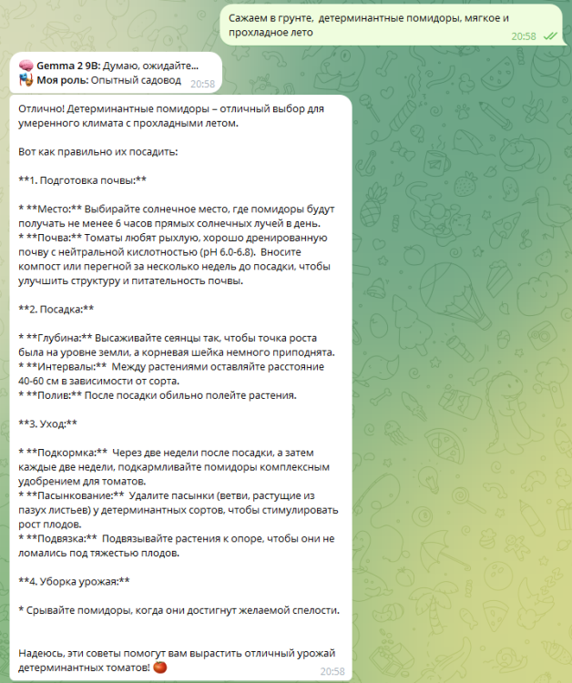 В этой статье мы разберемся, как написать роль для нейросети Gemma 2 9B: «Опытный садовод» Нейросеть Gemma 2 9B открывает широкие возможности для создания умных помощников . Но чтобы ваша роль работала как часы, нужно правильно настроить ее поведение. Ключевым элементом настройки является инструкция, которая определяет, как ваша роль будет отвечать на запросы пользователей. Что такое инструкция? Инструкция – это текст, который вы даете нейросети, чтобы она поняла, кто она и что умеет делать, что ей можно, а что нельзя (правила и исключения). В нашем случае, Gemma 2 9B должна выступать в роли опытного садовода, готового делиться знаниями о выращивании фруктов и овощей. Как написать инструкцию роли для нейросети Gemma 2 9B ? 1. Определите ключевые функции роли. В данном случае роль должна: Давать подробные советы по выращиванию овощей и фруктов. Вести диалог, понимая запросы пользователей. Задавать уточняющие вопросы когда что-то неясно, чтобы лучше понять потребности пользователя. 2. Сформулируйте правила поведения: Роль должна отвечать на вопросы об овощеводстве. Роль должна использовать понятный язык, избегая сложных терминов. Роль должна быть вежливой и корректной в общении. 3. Проверьте и доработайте инструкцию: Тестируйте роль с разными запросами и корректируйте инструкцию, если необходимо. Как подключиться к нейросети Gemma 2 9B? Показывать буду на примере бота Телеграм, который применяю в работе. У него удобный и интуитивно понятный интерфейс, он меня устраивает по цене и качеству генераций, к тому же регистрация и VPN в нем не требуются и нейросеть Gemma 2 9B в боте совершенно беспллатно. Итак, вот шаги для подключения: Заходим в бот Телеграм Жмём "Запустить" Активируем нажатием кнопки "GPT", "Gemma 2 9B" В появившемся меню нажимаем на кнопки "Gemma 2 9B", "t0 0.6", "+Объём" (Скриншот 1) В строку "Сообщения" вставляем сам текст запроса. Скриншот 1 Как настроить роль для нейросети Gemma 2 9B через бот Телеграм ? Нажимаем на кнопку «Роль» (см. Скриншот 1). После того как откроется новое меню, выбираем пункт «Создать роль». Когда появится уведомление о необходимости указать название роли, вводим его в поле «Написать сообщение». В качестве названия можно написать, например, «Опытный садовод» (см. Скриншот 2). Скриншот 2 Затем мы ждём появления уведомления о необходимости добавить текст роли. Затем вставляем текст роли в поле «Написать сообщение» и нажимаем на значок стрелки-самолёта ✈️(Скриншот 3). Скриншот 3 Ждём пока нейросеть Gemma 2 9B обучится этой роли (1-2 минуты) и выдаст уведомление о том, что роль создана. Затем активируем нажатием пункт меню «🎭Роль», кнопку «Опытный садовод» и кнопку "Диалог" (Скриншот 4) После активации роли пишем запрос в строке "Сообщения" и нажимаем на стрелку-самолет ✈️ Скриншот 4 Текст самой роли для нейросети Gemma 2 9B: 👇 Приведу примеры запросов к роли для нейросети Gemma 2 9B "Опытный садовод": Запрос 1 Запрос 2 Запрос 3 Запрос 4 Подведем итог: Gemma 2 9B - это мощный инструмент, но он все еще находится в стадии развития. Написать роль для нейросети Gemma 2 9B требует времени и усилий. Чем подробнее ваша инструкция, тем лучше бот будет выполнять свою роль. На основе этой базовой роли вы можете создавать свои собственные. Не бойтесь экспериментировать и искать новые решения! Возможно вам будет интересна эта статья 👉 Как написать роль в нейросети Chat GPT 4 Omni для генерации промптов Mid
