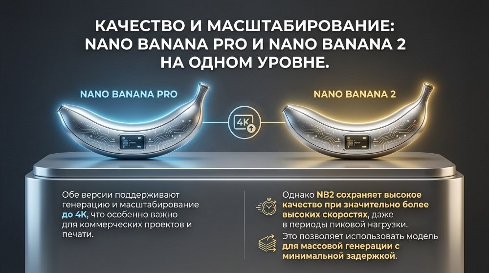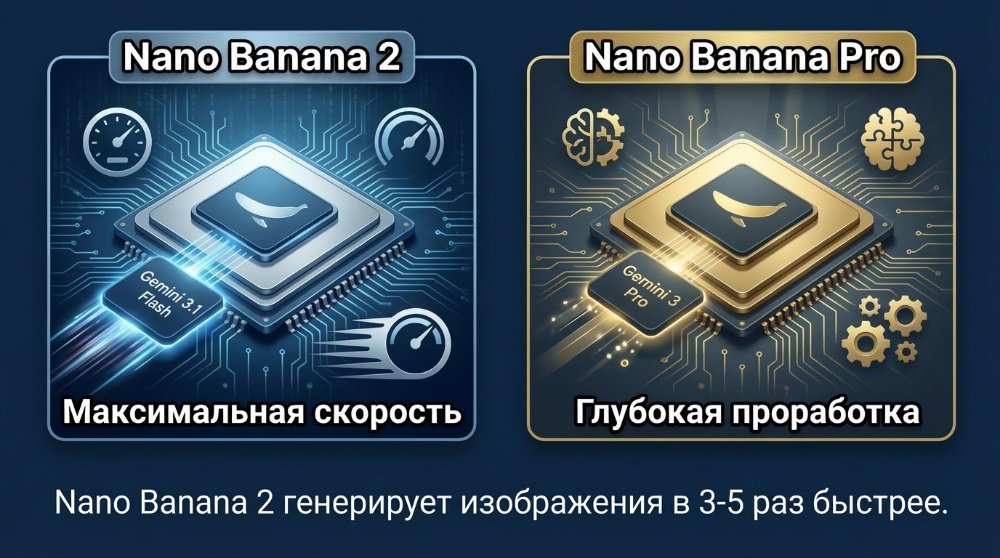 Модератор Ardi Опубликовано вчера в 05:32 Модератор Поделиться Опубликовано вчера в 05:32 В 2026 году сегмент генерации изображений претерпел значительные изменения благодаря выходу обновленной нейросети Nano Banana 2 (NB2), пришедшей на смену популярной Nano Banana Pro (NB Pro). Многие профессионалы и энтузиасты задаются вопросом: какая из этих моделей лучше подходит для различных задач, в чем заключается отличие, и стоит ли переходить на новую версию? Представляем подробное сравнение нейросетей Nano Banana Pro и Nano Banana 2, где рассмотрим ключевые особенности, преимущества и новые возможности NB2. Архитектура и производительность: чем Nano Banana 2 отличается от Nano Banana Pro Главное техническое отличие кроется в архитектуре. Nano Banana 2 построена на базе Gemini 3.1 Flash, ориентированной на максимальную скорость работы и расширенные возможности. В то время как Nano Banana Pro работает на Gemini 3 Pro — флагманском решении Google с приоритетом на сложную логику и глубину проработки. Однако благодаря оптимизации, NB2 генерирует изображения в 3-5 раз быстрее. Сравнение нейросетей по качеству текста: успехи Nano Banana 2 Одним из наиболее заметных улучшений Nano Banana 2 стала обработка длинных текстов. Ранее большинство ИИ-моделей допускали ошибки при работе с кириллицей и длинными надписями. Nano Banana 2 генерирует корректные надписи на русском языке, в том числе в длинных фразах. Например, при создании постеров с русскоязычными надписями отсутствуют пропущенные символы и лишние повторения. NB2 особенно порадовала в тестах с китайским языком и сложной типографикой, что делает её фаворитом для международных проектов и задач, где важно качество текстовой части картинки. Контекст и понимание физики: шаг вперед для Nano Banana 2 Сравнение нейросетей показало, что Nano Banana 2 значительно лучше учитывает не только буквальные инструкции, но и логику сцены, а также физику предметов и окружения. В задачах, где требуются зеркала, искажения, отражения или корректное расположение объектов, Nano Banana 2 практически не допускает ошибок: надписи действительно инвертируются в зеркалах, физика света сохраняется, а фрагменты окружающей среды логично дополняют друг друга. Интеллектуальные возможности NB2: умнее, подробнее, глубже Nano Banana 2 значительно превосходит Pro в решении сложных логических, научных и образовательных задач. Искусственный интеллект обладает расширенным словарным запасом и демонстрирует более точные знания по географии: при обозначении города на карте в инфографике Nano Banana 2 корректно размещает рядом реальные соседние города. Режим «Thinking» с тремя уровнями глубины (быстрота, качество, динамика) обеспечивает высокую смысловую насыщенность инфографики и постеров, что позволяет им максимально точно соответствовать заданному промту, вплоть до мельчайших деталей. Качество текстур и работа с материалами в сравнении с Nano Banana Pro Еще одно важное отличие Nano Banana 2 — улучшенное понимание текстур. Тесты показали, что NB2 отлично справляется с передачей сложных поверхностей: льняная ткань выглядит реалистично, металлические объекты приобретают характерный блеск и отражения, вода на макро-снимках формирует капли с естественными линзовыми искажениями. Такой рост качества особенно заметен на фоне Pro-версии, где иногда текстуры оставались плоскими или некорректно сочетались. Анатомические пропорции и рисование сложных сцен c помощью